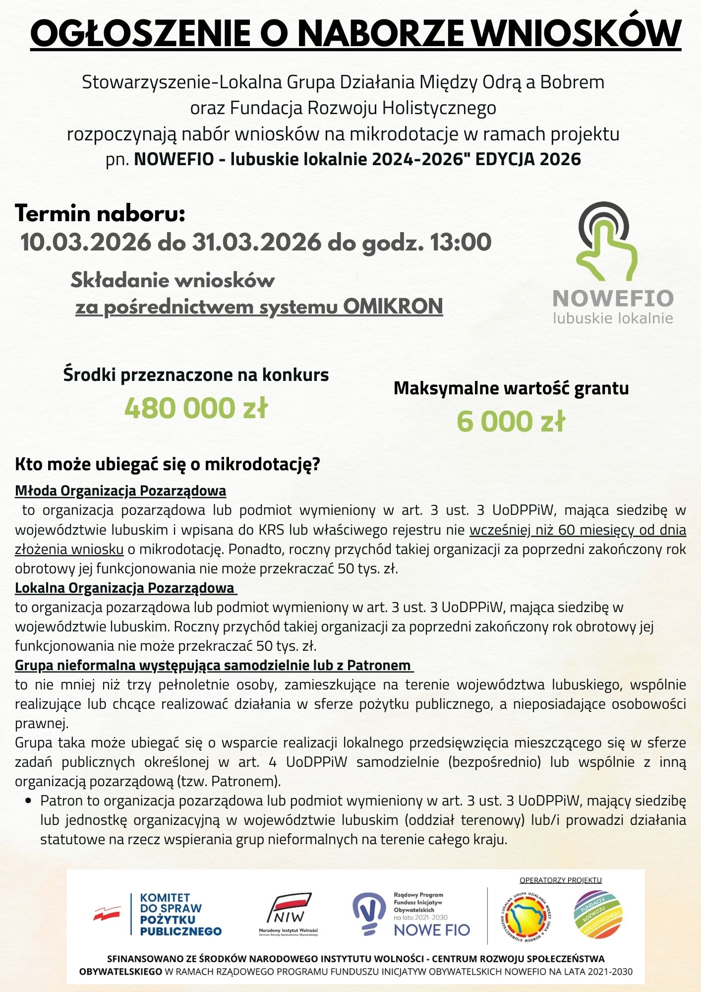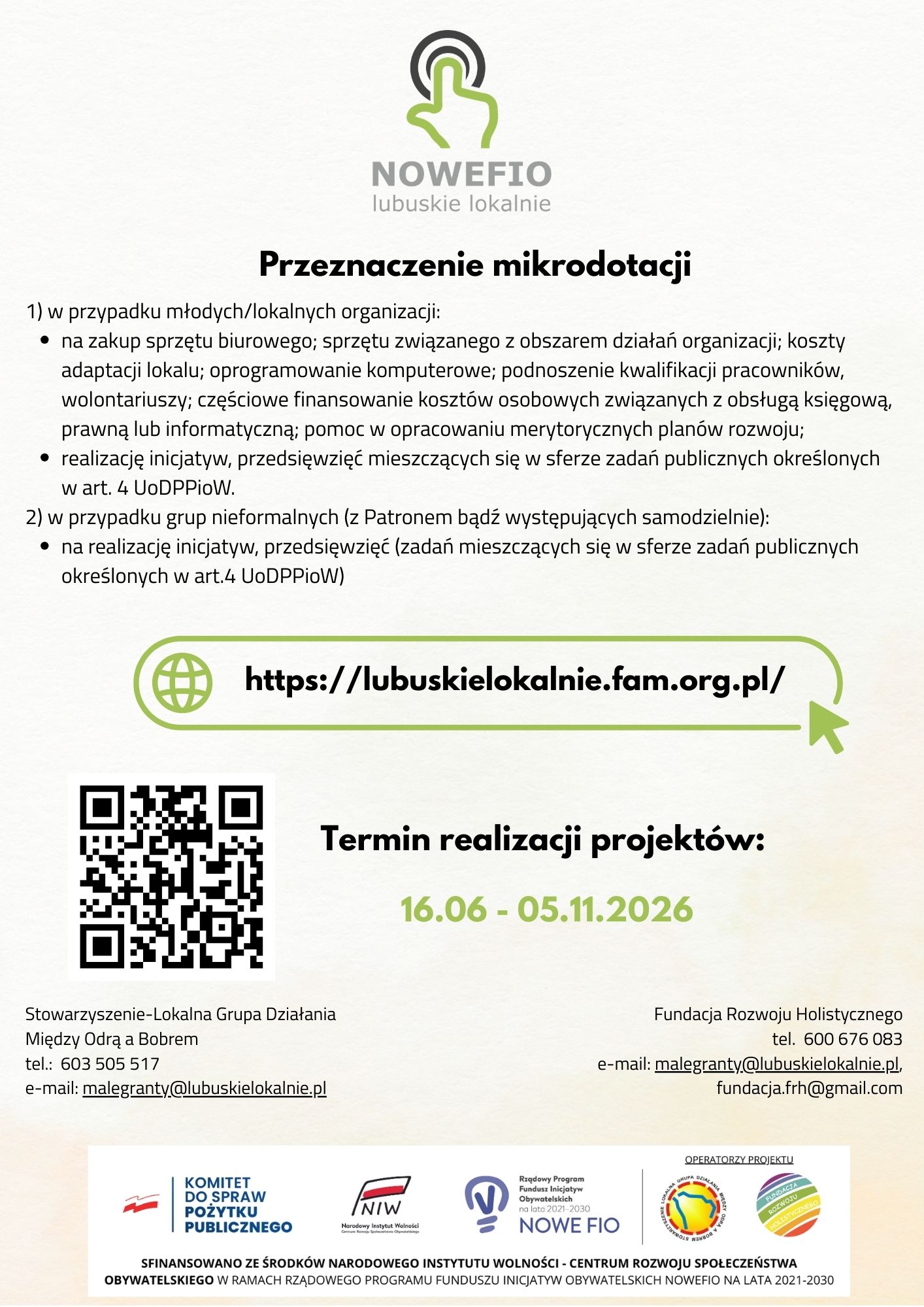 Stowarzyszenie Lokalna Grupa Działania Między Odrą a Bobrem wraz z Fundacją Rozwoju Holistycznego ogłosiły nabór na mikrodotacje dla organizacji pozarządowych oraz grup nieformalnych z województwa lubuskiego.